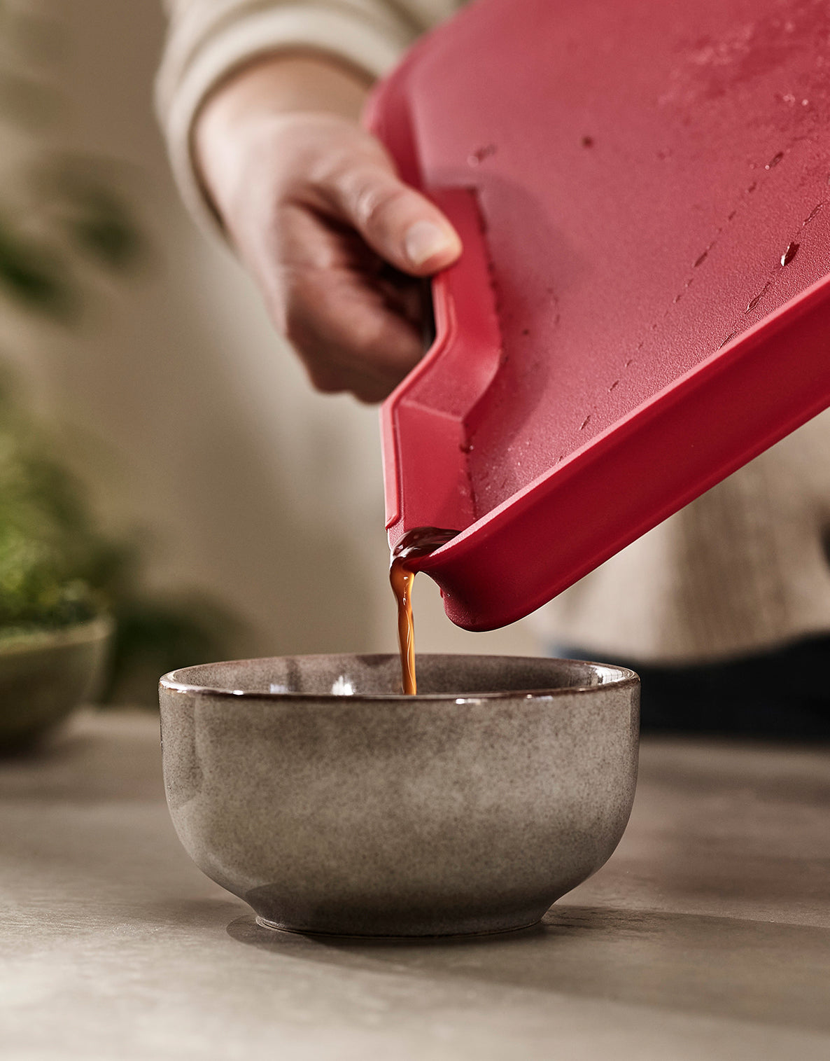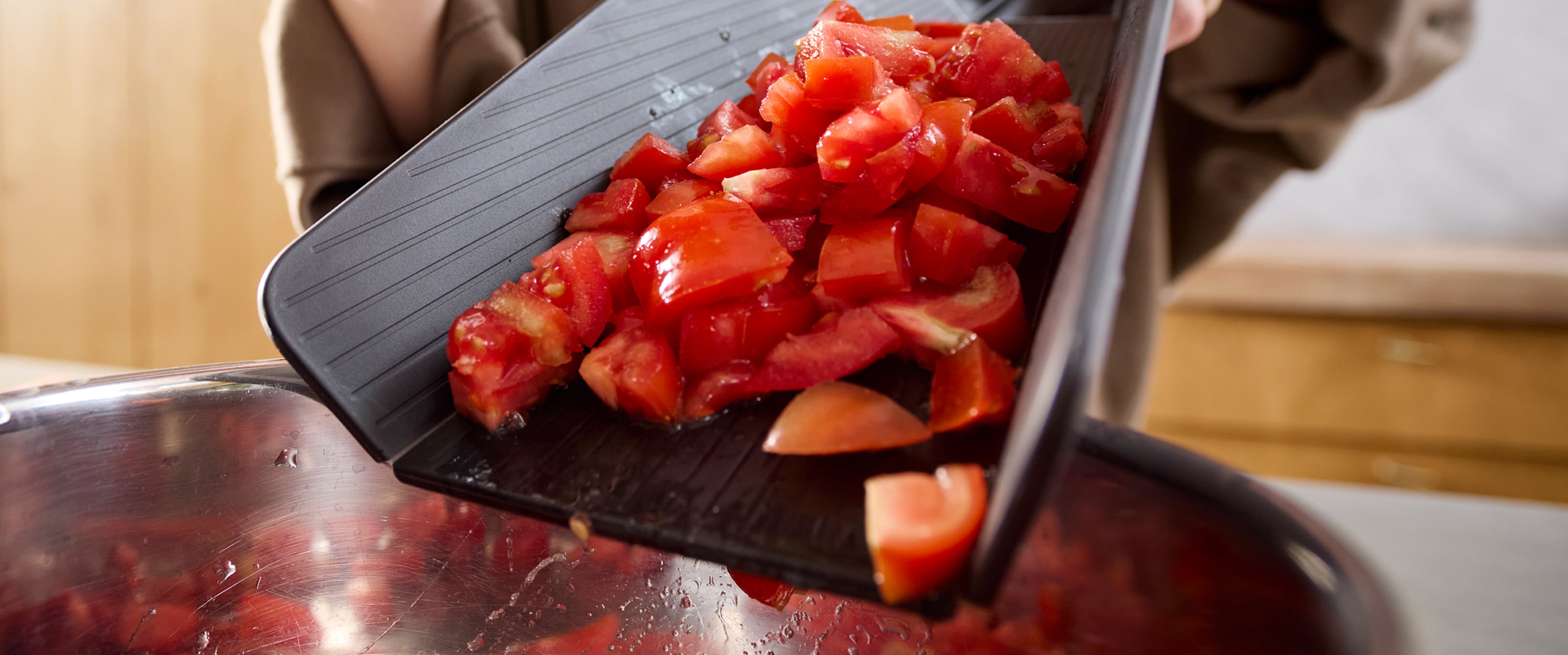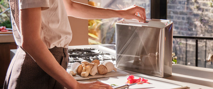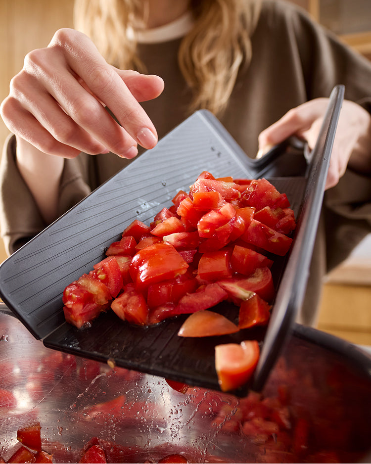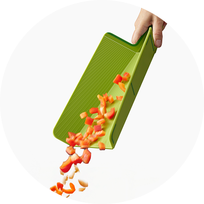 Our award-winning Chop2Pot™ chopping board cuts out the mess of moving chopped food into pans or off-cuts into the compost caddy. The clever, foldable design creates a chute for easy pouring and no-mess food transfer. Simply squeeze the soft-grip handle, and the edges of the board fold.