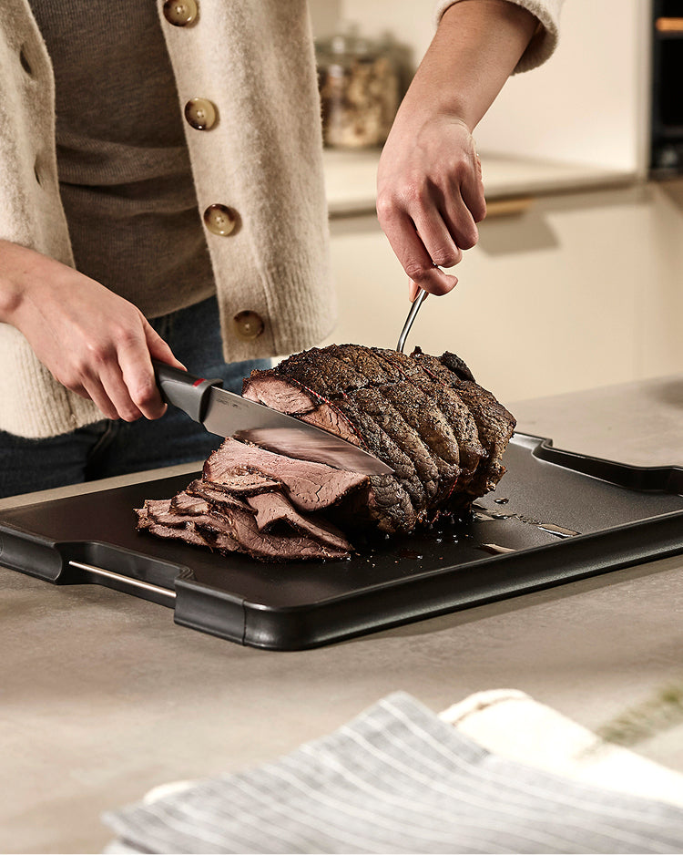As the name suggests, Cut&Carve™ serves two functions: cutting and carving. Often, large portions of meat can be tough to cut as they slide across the board, and the juices released can drip onto the kitchen surface causing a mess.