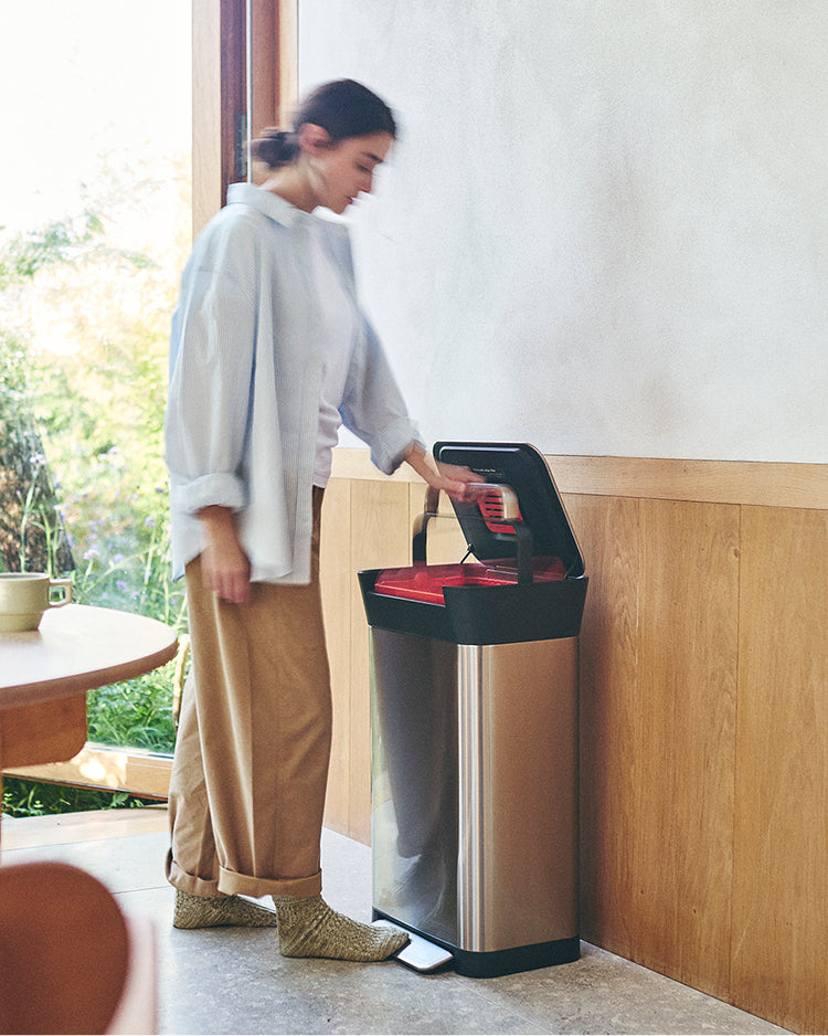 If you’re looking for a streamlined rubbish solution, consider Arc™, which has a pedal within the body of the bin itself. It boasts a handy pocket which stores replacement bin liners at the back of the bin, so that you always have liners on hand when you need them most. Arc™ stores 30L of rubbish, and is also available in a smaller 10L format. Foot pedals are especially handy when you’re in the middle of a messy kitchen task and don’t want to use your hands to open the bin. The lid is soft-close for a satisfying and smooth experience.