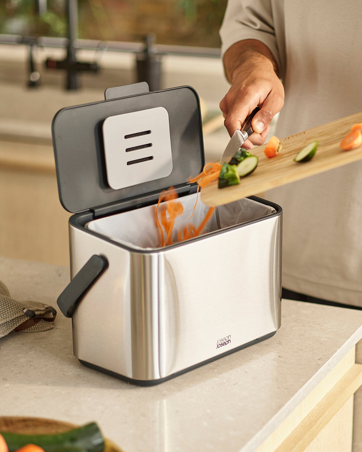 Our food waste caddies are easy-to-fill and are designed to reduce mess during meal prep, keeping your kitchen clean and tidy. Collect™ is made of stainless-steel which is a durable material as well as a good one for blocking out smells. It has an integrated odour filter, which hides discreetly on the underside of the bin lids.