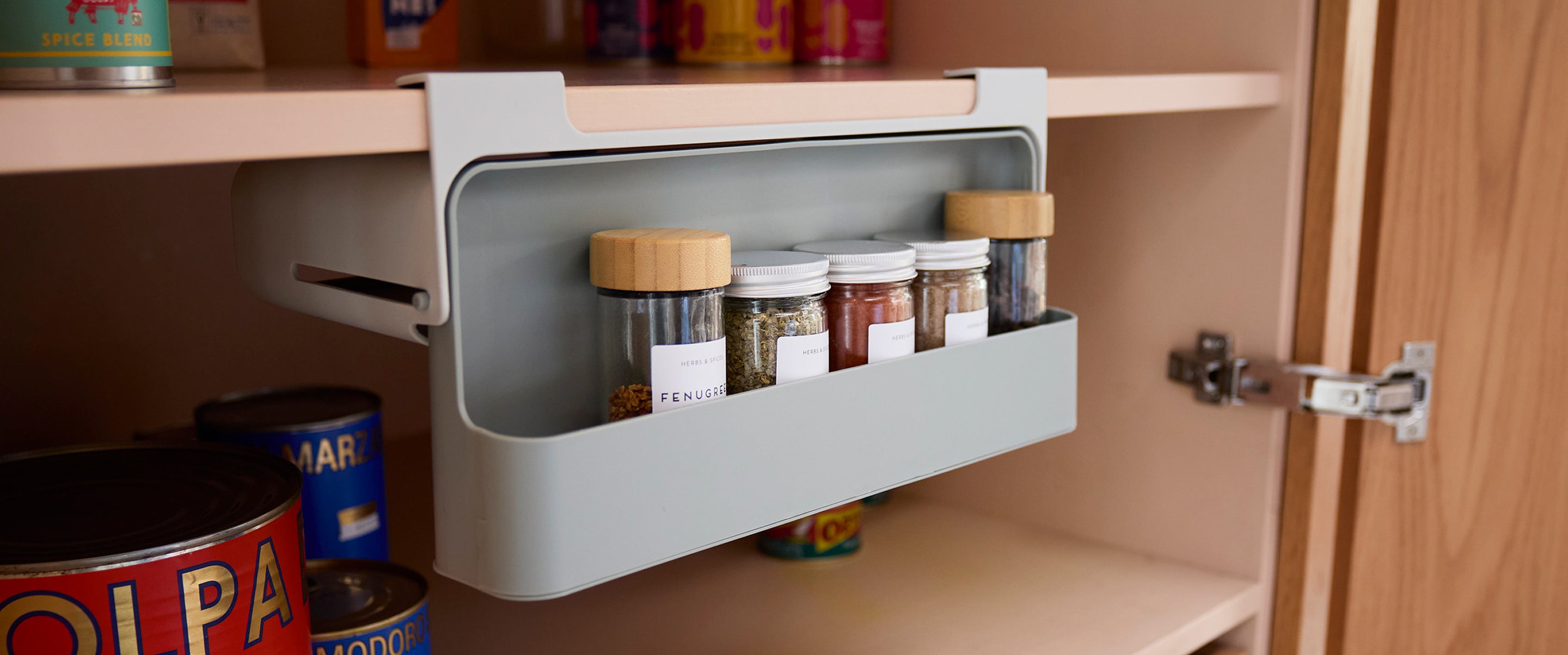 Tip: use clever tools like the CupboardStore™ Undershelf Spice Rack to free up counter space and make use of unused areas.