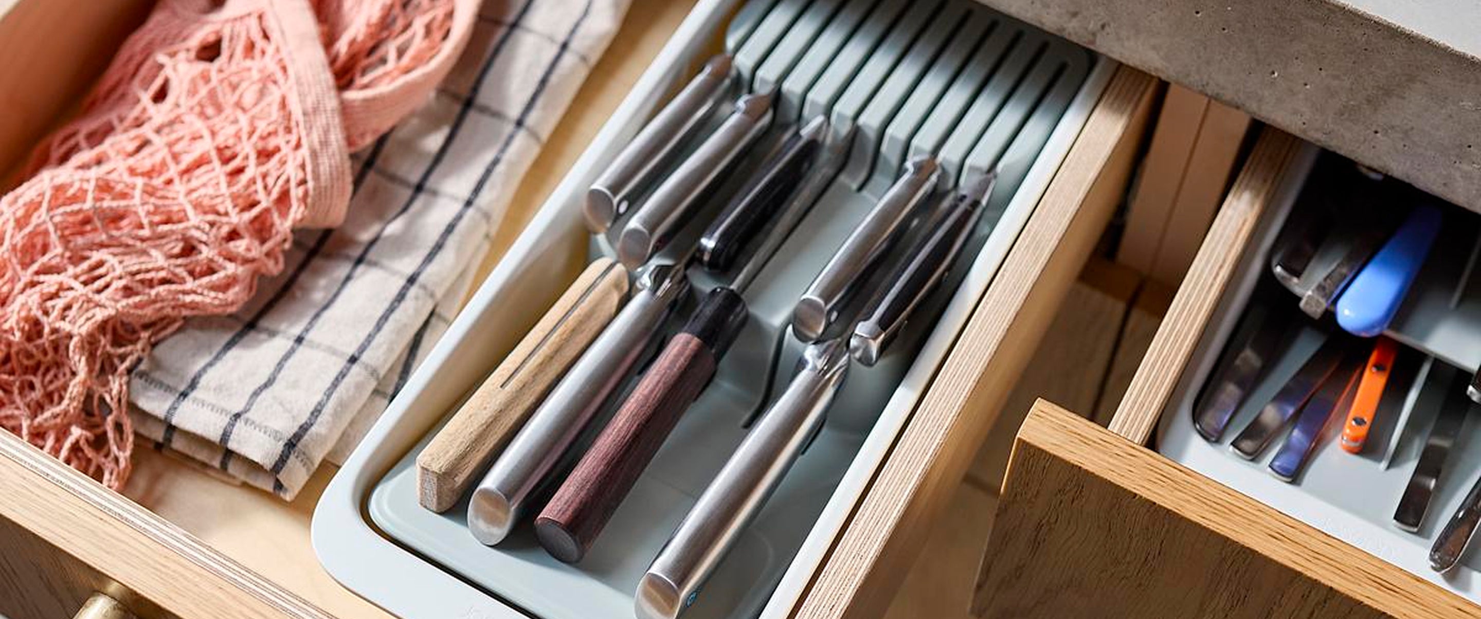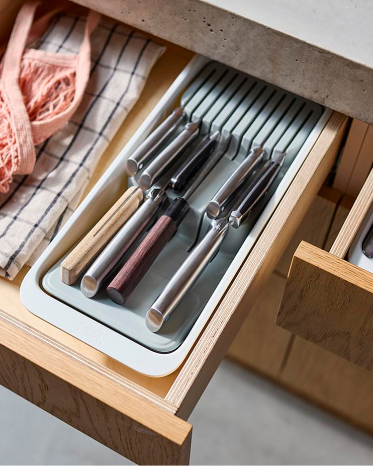 Rather than scattered in a drawer, store your knives and utensils in a dedicated set, like the Joseph Joseph 10-piece In-drawer Set for safety and efficiency.