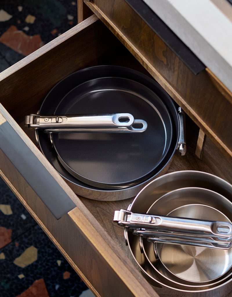 Rather than stacking, store pots and pans side-by-side with dividers, so they're easy to access and less likely to scratch. Our Space Cookware range comes with revolutionary folding handles that allow for stacking, without the handles taking up space.