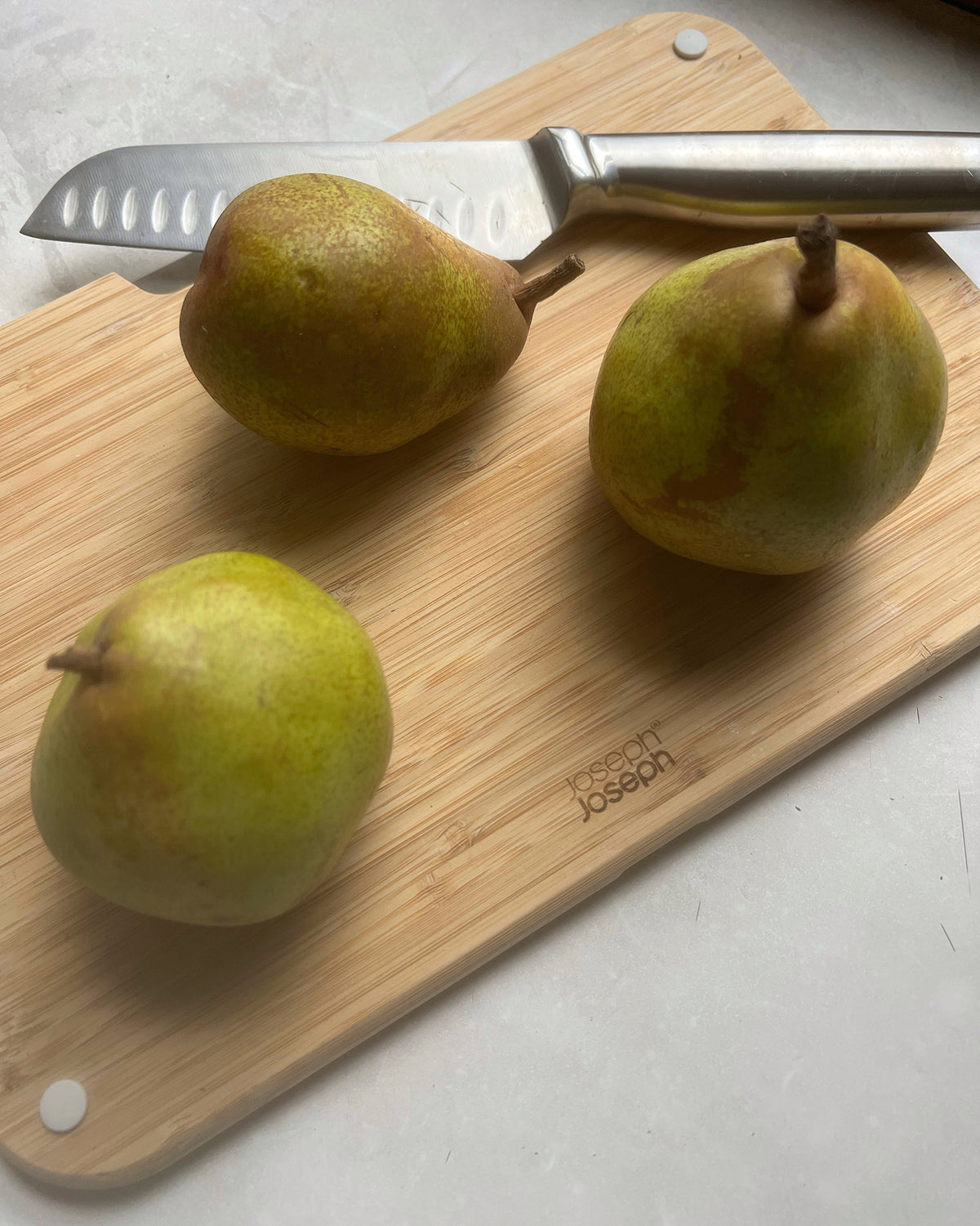 - Step 1Preheat the oven to 175°c fan. Cut the pears away from the stalk into 4 large pieces each. Slice each one very finely into a fan shape, leaving the small tip of the pear uncut, so that it holds together.